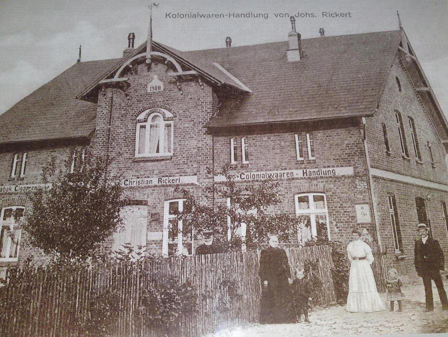 1907    –    Der Sohn Johannes Rickert übernimmt das Wohnhaus und den Kolonialwarenladen seines Vaters. Das folgende Bild wurde im diesem Zeitraum aufgenommen. Der dort zu sehende Wetterhahn von 1823 kann im heutigen Hofladen begutachtet werden.